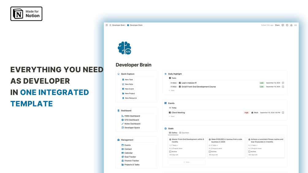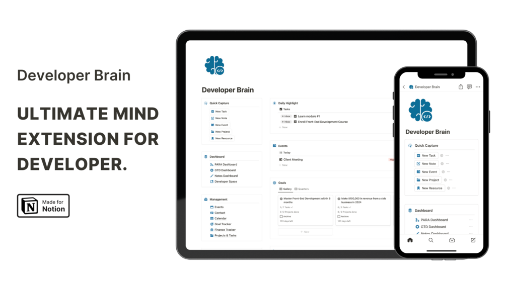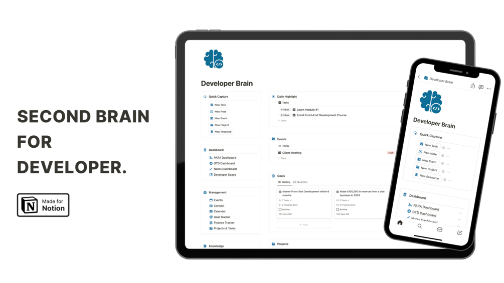 Developer Brain is your all-in-one Notion template designed to be your second brain. It helps you manage projects, track goals, organize notes, and everything in between.