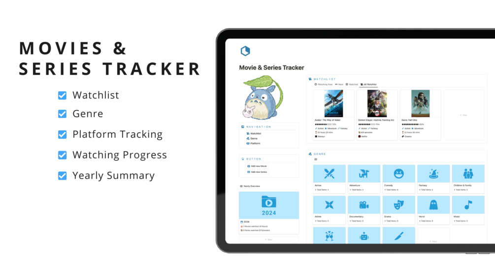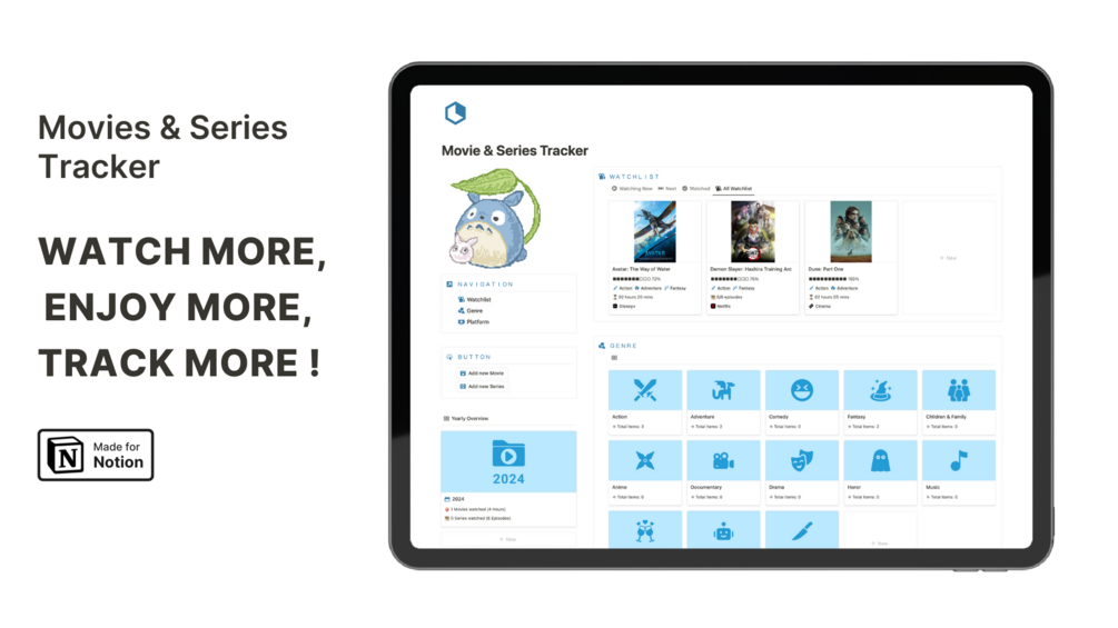 Say hello to the Movie & Series Tracker Notion Template – your new buddy for keeping tabs on all your favorite flicks and shows. Whether you’re a binge-watcher or just catching a few things now and then, this template has everything you need to keep track of what you've watched, what's next on your list, and much more.